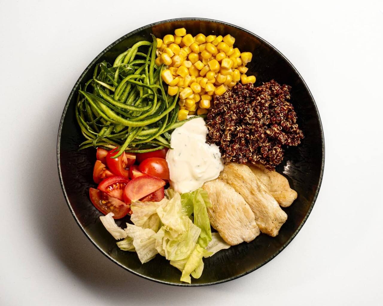 курка, помідори чері, кукурудза, айсберг, огірок, кіноа, йогуртовий соус