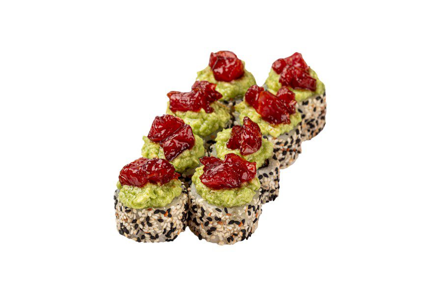 норі, рис, крем-сир, манго, креветка, чорний кунжут, білий кунжут, гуакамоле, тунець, соус унагі