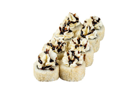 Норі, рис, крем-сир, копчений лосось, сніжний краб, авокадо, соус унагі