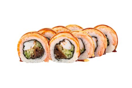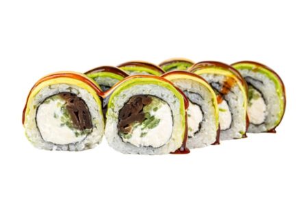норі, крем-сир, огірок, авокадо, сирні шапочки, соус унагі, горіховий соус