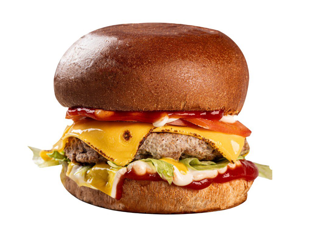 яловича котлета з перцем халапеньйо та синьою цибулею, пухка булка, помідор, тостовий сир, айсберг, синя цибуля
