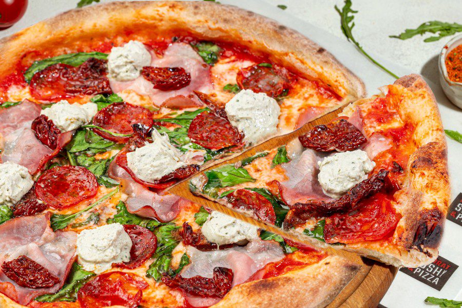 моцарела, пепероні, шинка, шпинат, в’ялені томати, соус базилік, томатний соус