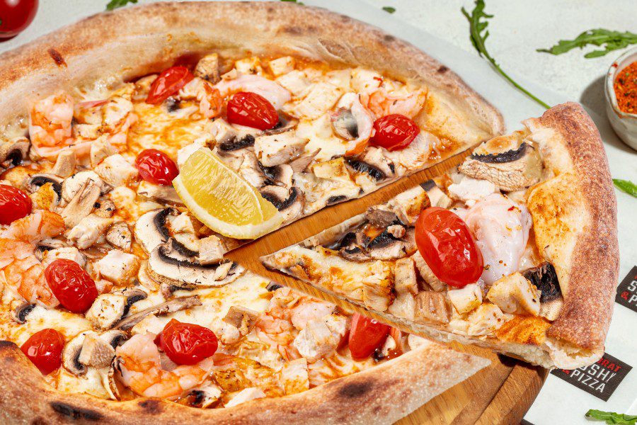 моцарела, шампіньйони, запечена курка, креветки, помідори чері, лимон, соус том ям