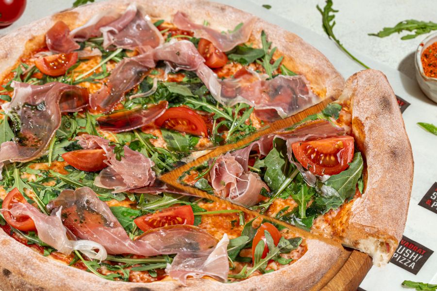 моцарела, прошуто, рукола, помідори чері, соус песто, томатний соус