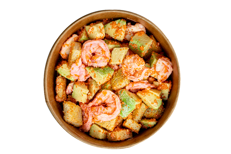 тигрові креветки, авокадо, сухарики, помаранчева ікра масаго, соус спайсі