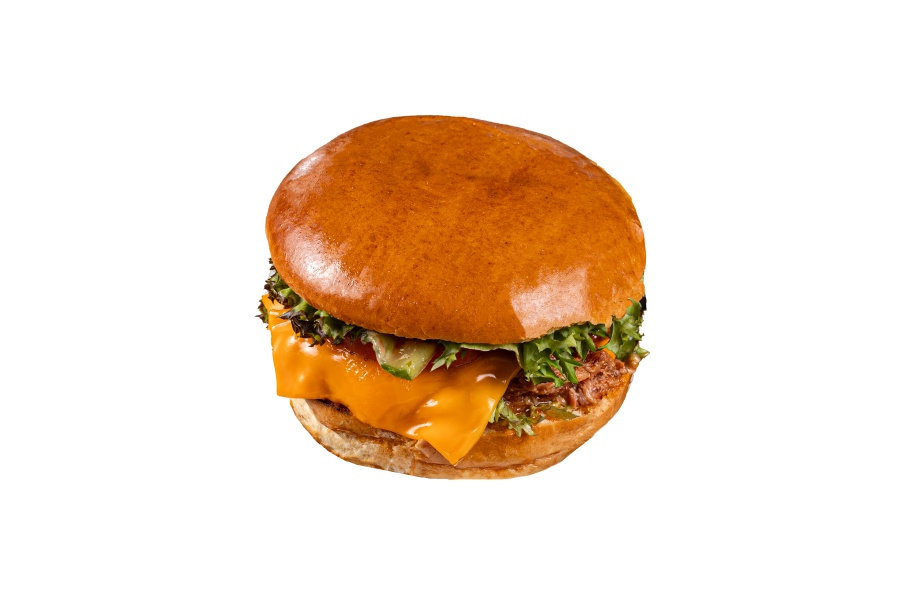 булка, рвана свинина, айсберг, помідор, огірок, тостовий сир, соус бургер, соус цезар