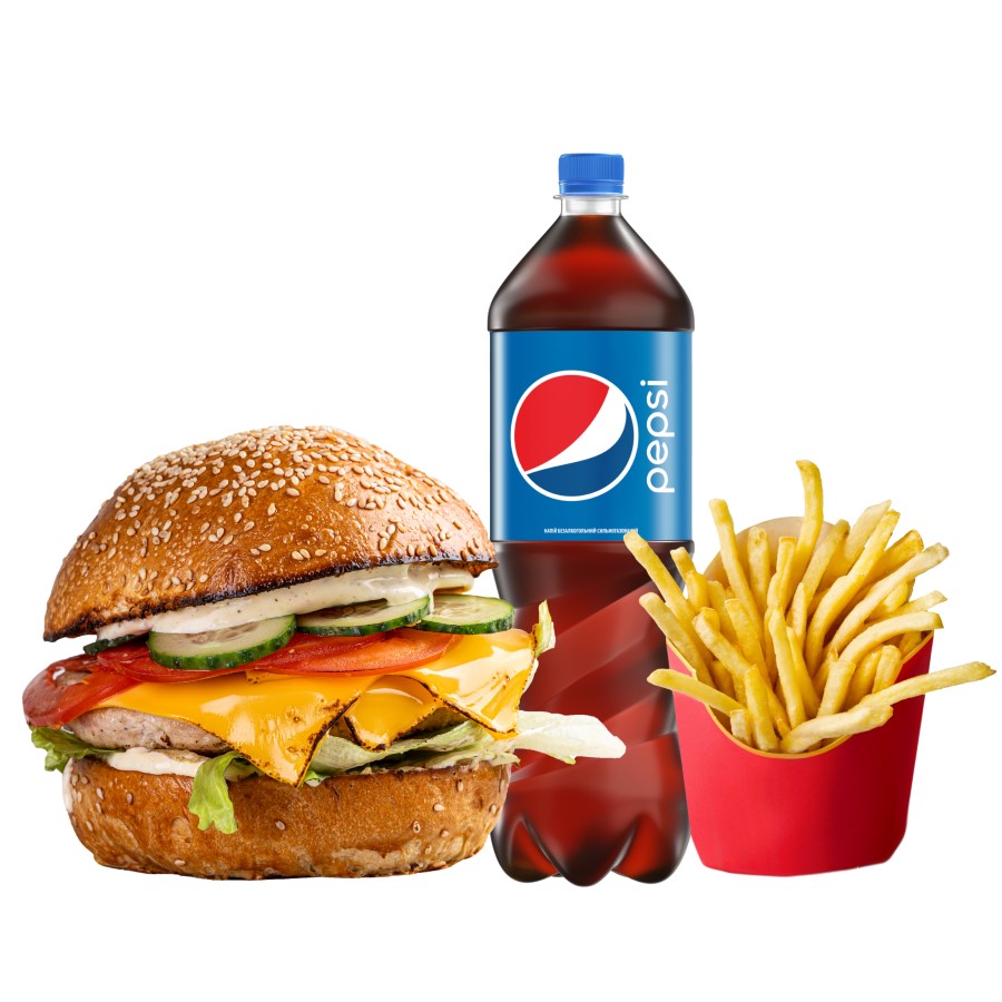 чікен бургер (куряча котлета, тостовий сир, соус від шефа, айсберг, помідор, огірок), картопля фрі, кетчуп, Pepsi 0,5л