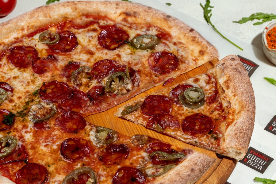 моцарела, пепероні, перець халапеньйо, томатний соус, соус песто