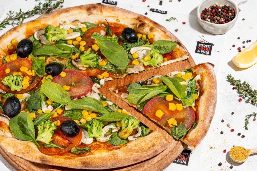 шпинат, шампіньйони, броколі, кукурудза, маслини, помідори, томатний соус