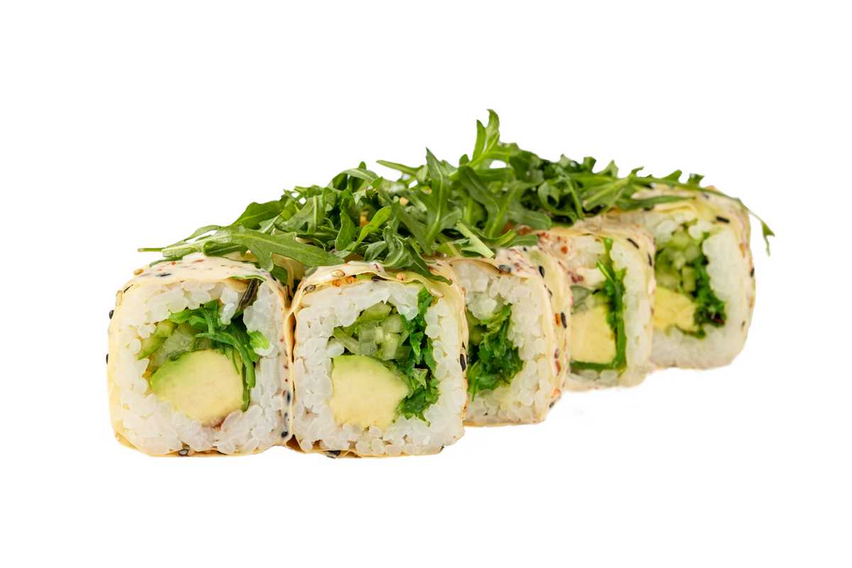 Соєвий папір з кунжутом, рис, чука, огірок, авокадо, горіховий соус, рукола