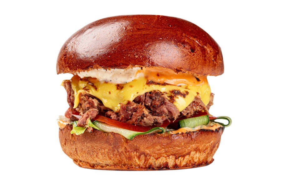 булка, рвана свинина, айсберг, помідор, огірок, тостовий сир, соус бургер, соус цезар