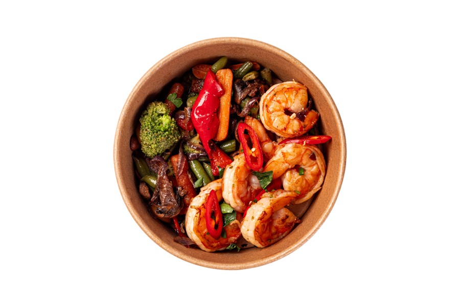 рисова локшина фунчоза, броколі, стручкова квасоля, перець болгарський, цибуля кримська, печериці, морква бейбі, креветки, перець чилі, соус, арахіс, кунжут, цибуля зелена