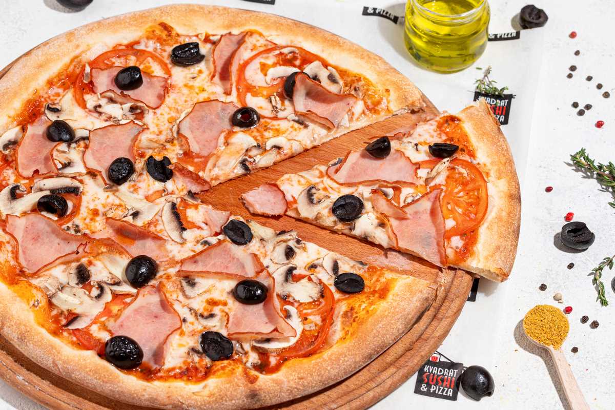 моцарела, помідори, шампіньйони, шинка, маслини, томатний соус