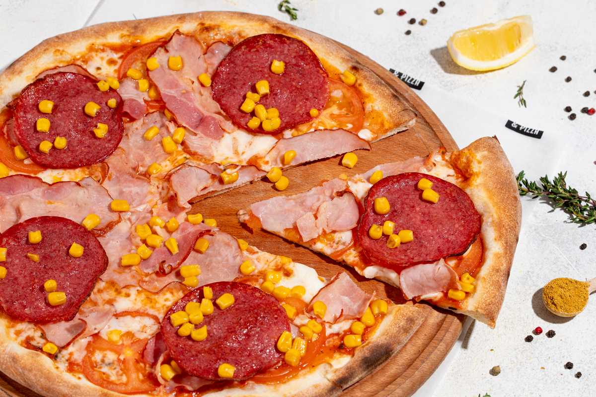 моцарела, шинка, курка, салямі, кукурудза, вершковий соус