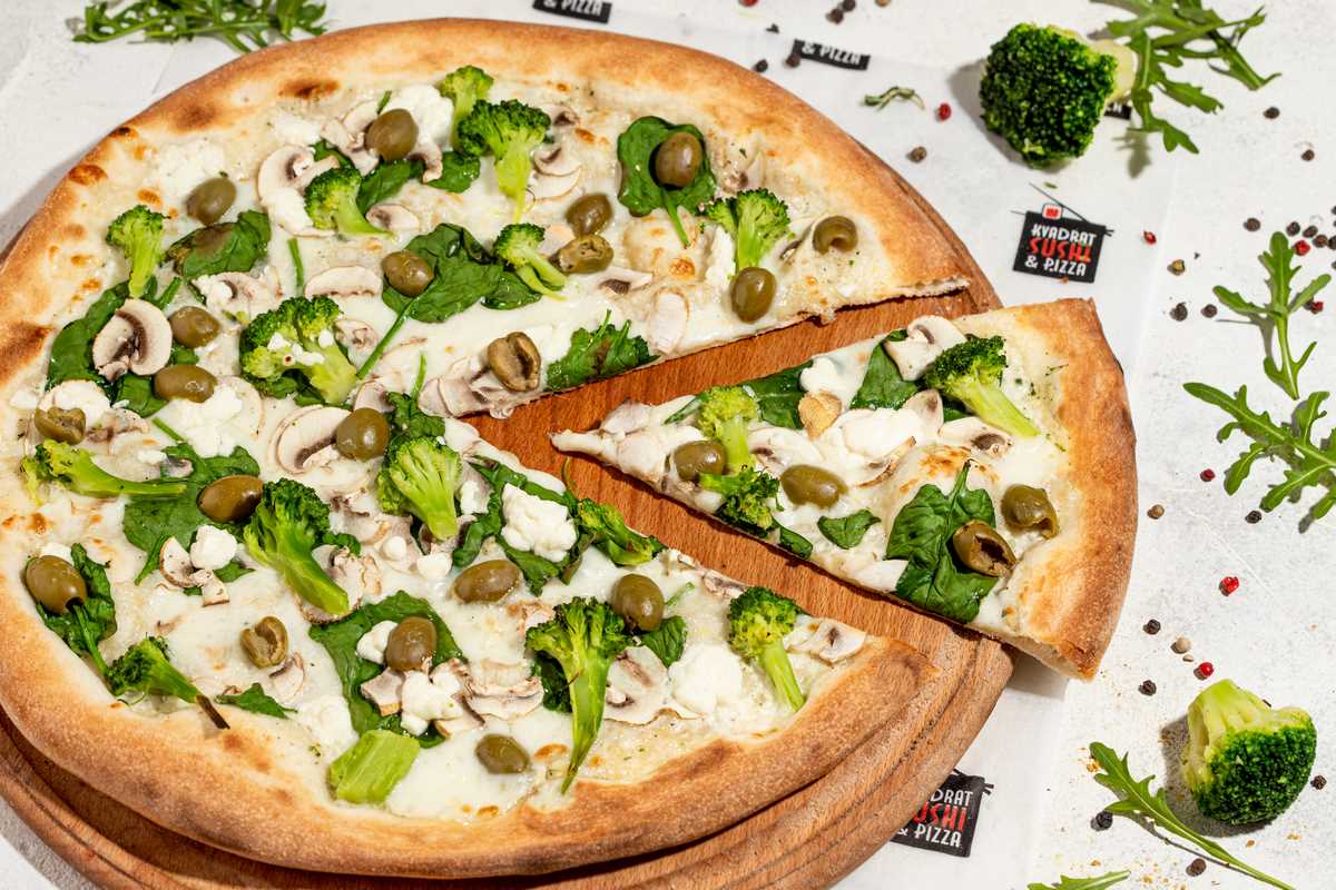 моцарела, шпинат, шампіньйони, броколі, сир фета, оливки зелені, вершковий соус