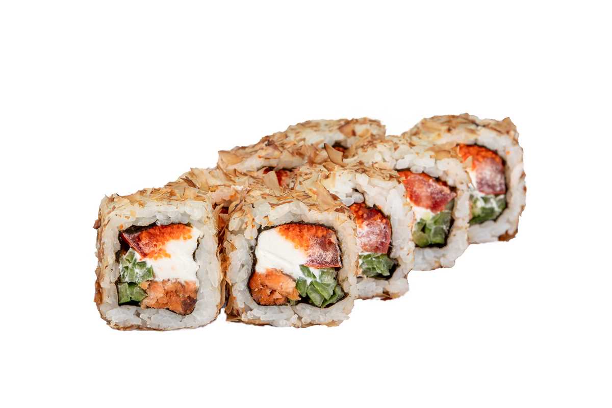 норі, рис, стружка тунця, крем-сир, помідор, огірок, ікра масаго, лосось теріякі
