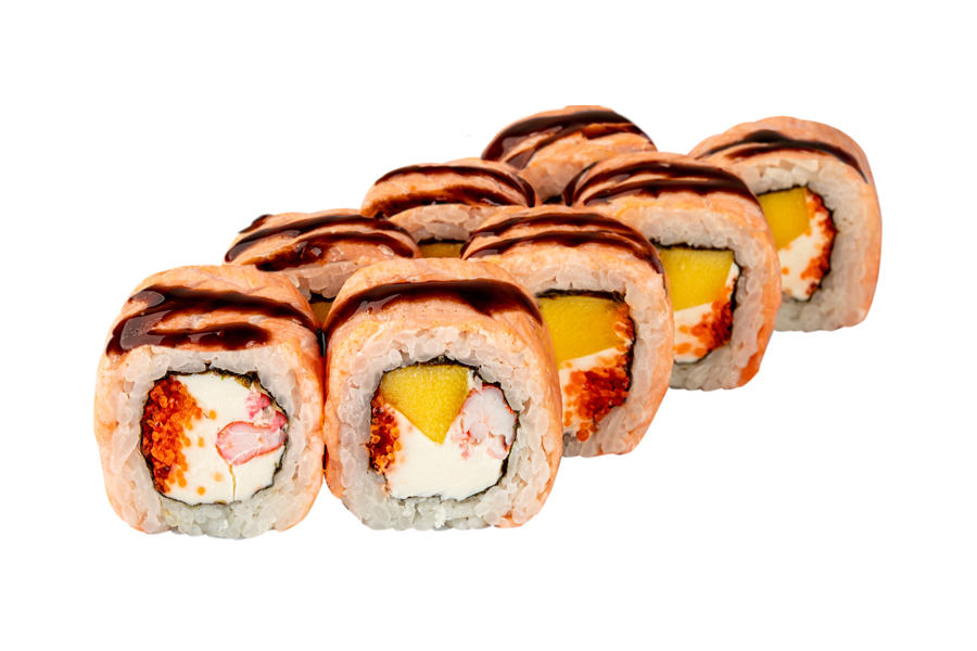 норі, рис, крем-сир, лосось, креветка, манго, ікра масаго, соус унагі