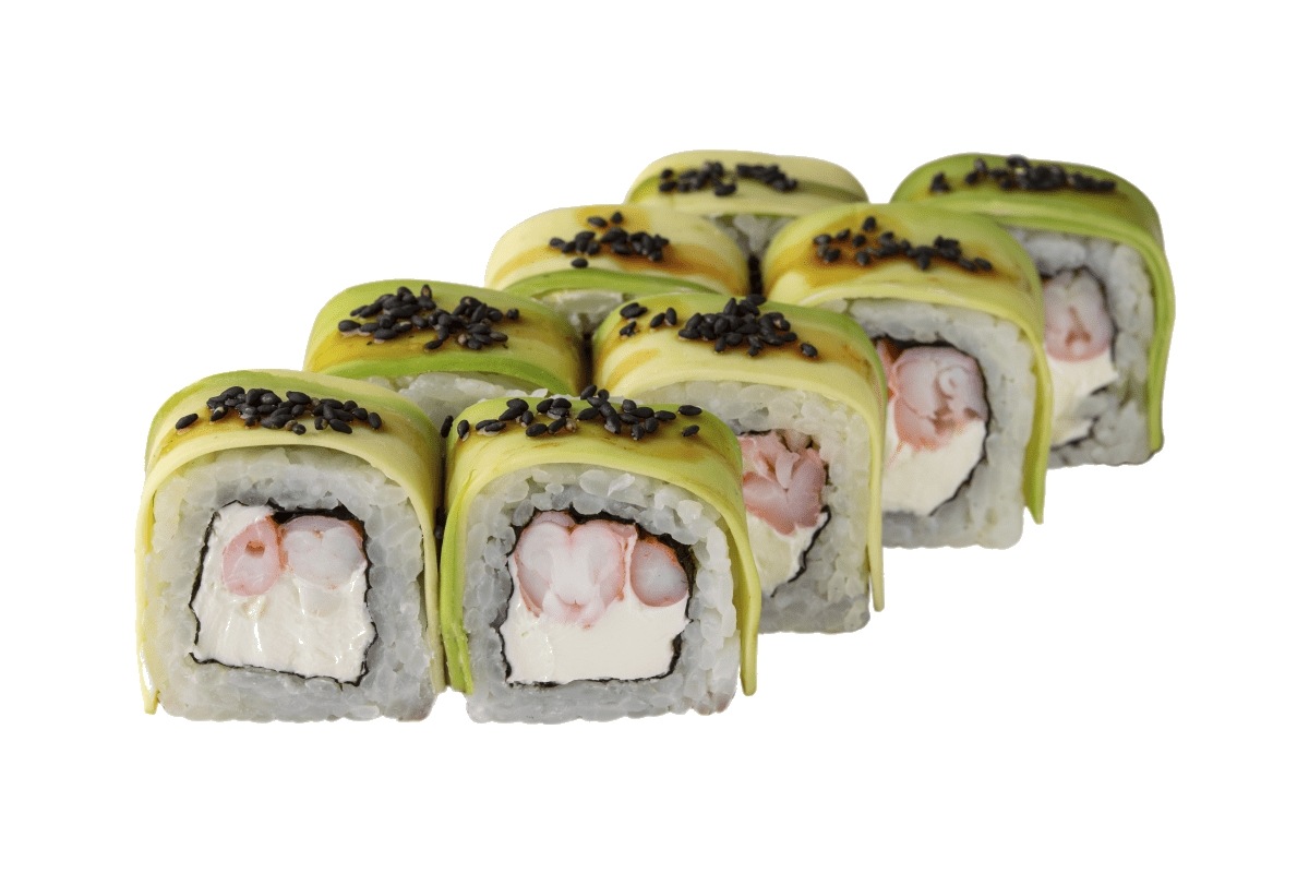 Норі, рис, крем сир, креветка, авокадо, кунжут чорний, соус унагі