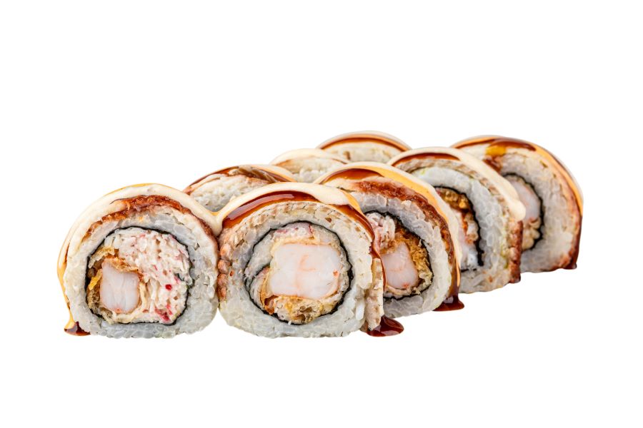 норі, рис, креветка в клярі, сніжний краб, вугор, соус спайсі, соус унагі, сирний соус