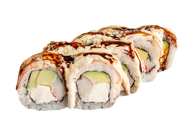 норі, рис, крем-сир, авокадо, сніжний краб, креветка, сирний соус, соус унагі, мигдальні пластівці