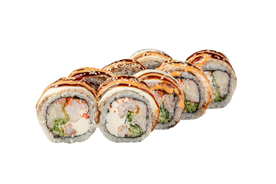 норі, рис, крем-сир, сніжний краб, вугор, креветка, ікра масаго, соус спайсі, соус унагі, кунжут