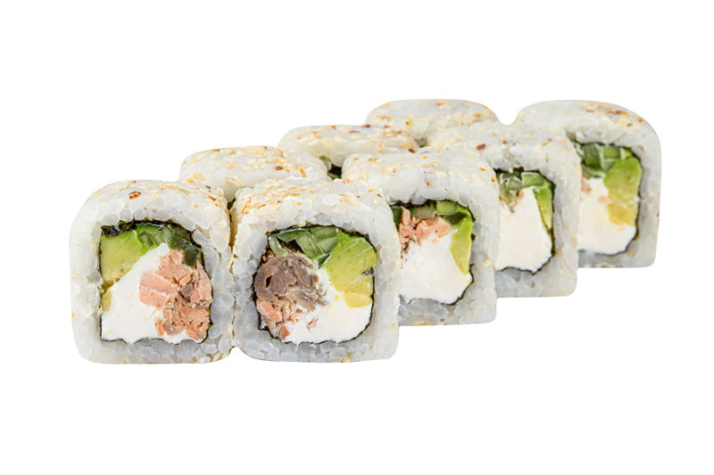 Норі, рис, лосось теріякі, огірок, крем-сир, кунжут білий, авокадо