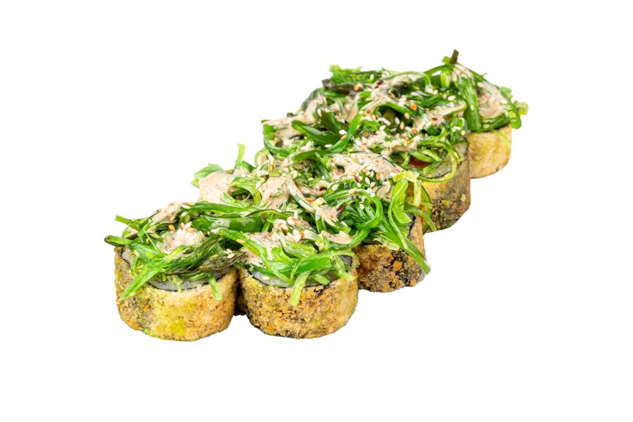 норі, рис, сніжний краб, копчений лосось, чука, зелена цибуля, кляр, кунжут, горіховий соус
